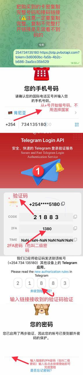 陆步骤:把购买到的卡密复制完整—-去飞机输入购买到的号码点击登陆—-点击登陆后打开链接查看验证码和二级密码——输入验证码——-输入二级密码—完成登陆